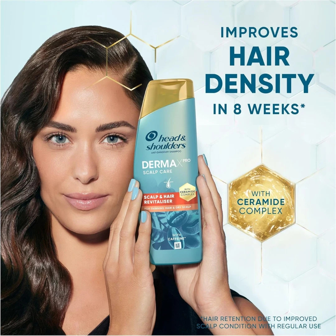 Head & Shoulders DermaXPro Revitaliser Anti-Dandruff Shampoo with Caffeine and Ceramide Complex is specially designed to help moisturise a dry scalp, reduce dandruff, and support thinning hair. Its advanced formula nourishes, strengthens, and reinforces the scalp’s natural skin barrier.