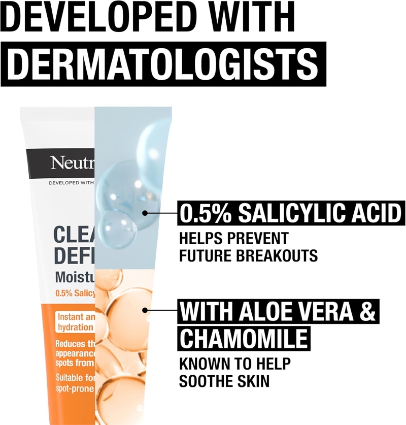 This oil-free moisturiser has been developed with dermatologists to provide 24-hour hydration without clogging pores. Formulated with aloe vera and chamomile, the NEUTROGENA Clear & Defend 0.5% Salicylic Acid Moisturiser is clinically proven to help prevent spots and fade spot marks while respecting the skin’s natural balance, for a smoother, clearer complexion. With aloe vera & amp; chamomile, this formula fades spot marks, respecting the skin’s natural balance. Instantly hydrates & replenishes skin moisture to strenghten skin barrier