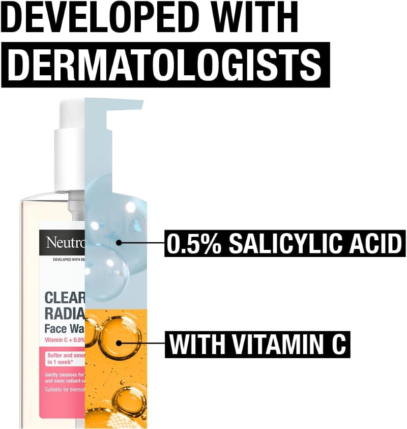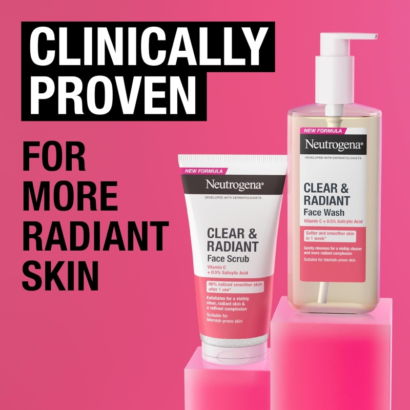 About this item Essential face wash: This face wash for normal skin was developed to help prevent imperfections and gently cleanse, without over-drying skin, for a clearer and more radiant complexion Active ingredients: The gentle cleanser contains skin-loving vitamin C and Pink Grapefruit, helping to create a clearer radiant complexion with every wash Clinically tested: The oil-free face wash has been developed alongside dermatologists to create an effective formula — 82% of users have said they noticed brighter skin in just 4 weeks of use* Application instructions: Wet your face. Massage the vitamin C face wash onto face in the morning and evening. Rinse thoroughly. Pat your face dry. Follow with moisturiser Product delivery: Neutrogena Clear & Radiant Facial Wash (1x 200ml), purifying and cleansing face wash with vitamin C and Pink Grapefruit for clearer, radiant skin Packaging may vary